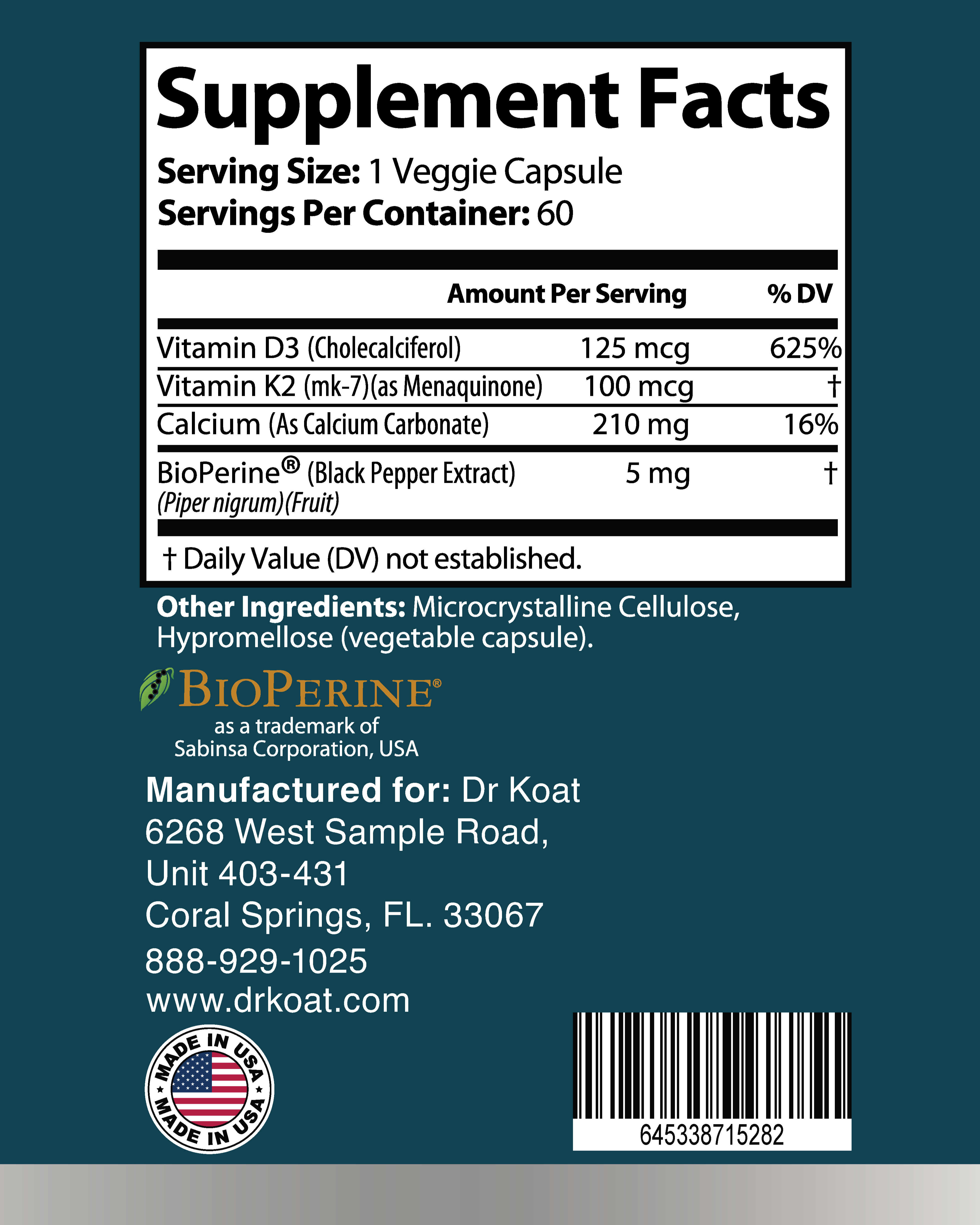 The combination of Vitamin D3 and Vitamin K2 (MK-7) works together to support proper calcium metabolism and overall health.